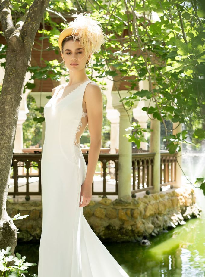El vestido de novia HALANA de Alma Novia es la máxima expresión de sofisticación y feminidad. Su corte sirena en crepé fino realza la figura, mientras el escote en V frontal y trasero aporta un toque sensual. La capa opcional en georgette añade un aire etéreo y elegante, ideal para novias que buscan un diseño romántico con un estilo moderno y único.