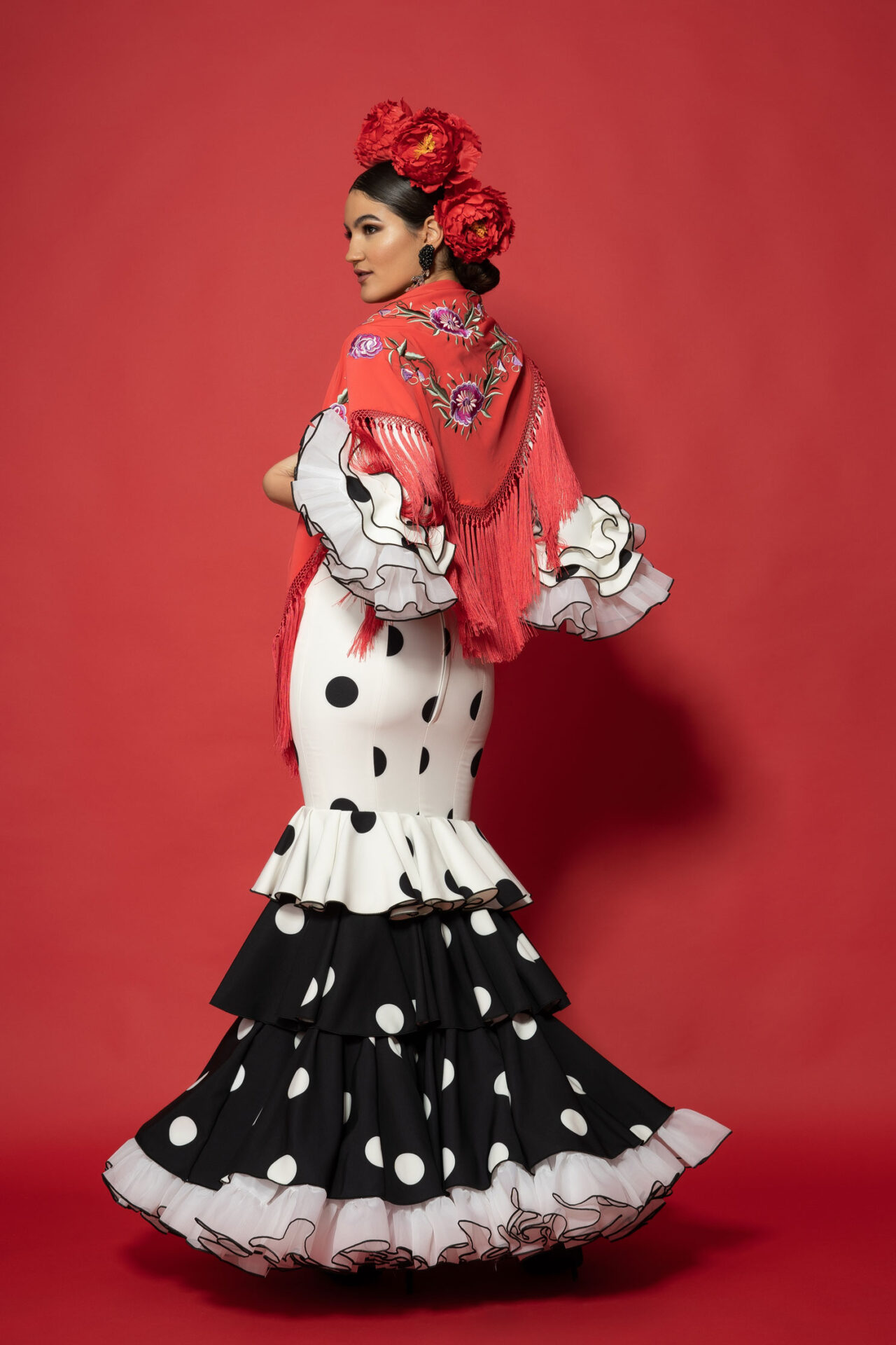 Vestido elástico con tres volantes y enaguas de clavel en los bajos, escote de pico delante y detrás