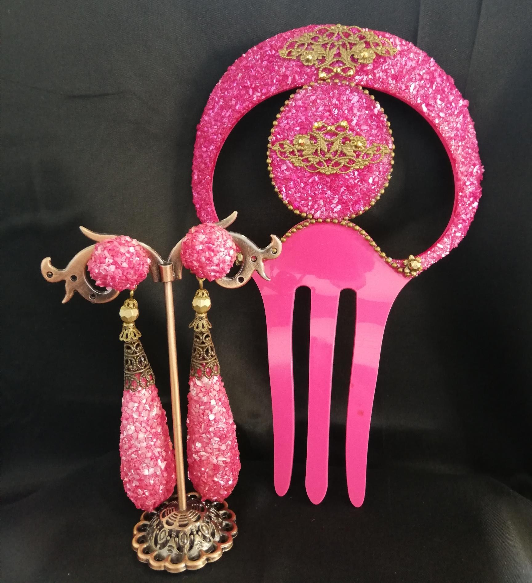 Conjunto de pendientes y peineta arenilla de cristal en color fucsia y detalles en dorado.
