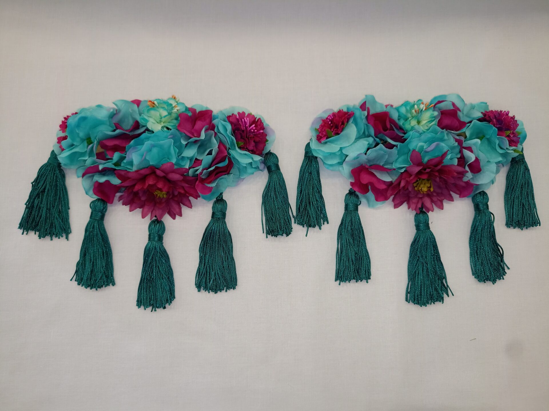 Hombrera de flamenca combinada en verde agua y morado, con borlas de flecos en verde agua.
