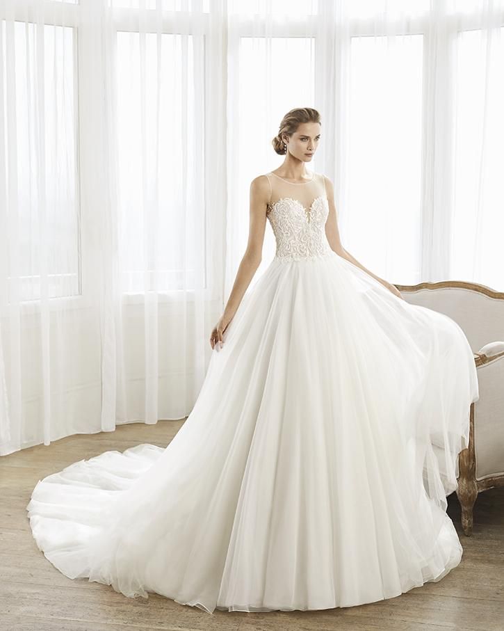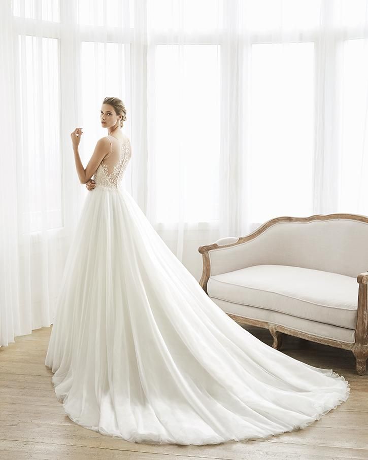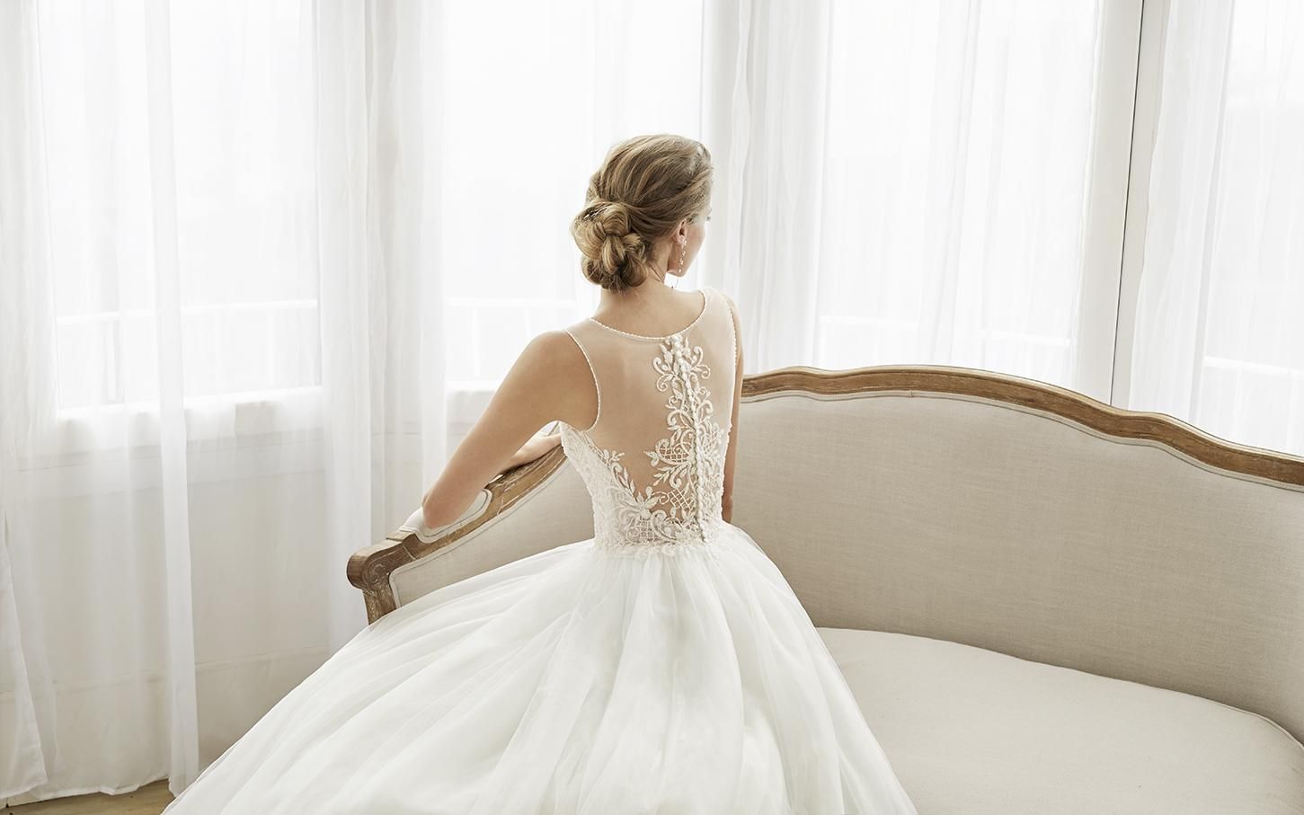 Vestido de novia de línea princesa con bordados de pedrería en el cuerpo que aportan mucha luz a la novia. Escote en forma de corazón, apoyado por un sutil tul de seda transparente que no llega a apreciarse. Detrás, sobre ese mismo tul invisible, lleva unos bordados en strass con motivos florales a ambos lados de la hilera de botones forrados que suben en toda la espalda. Imponente cola.