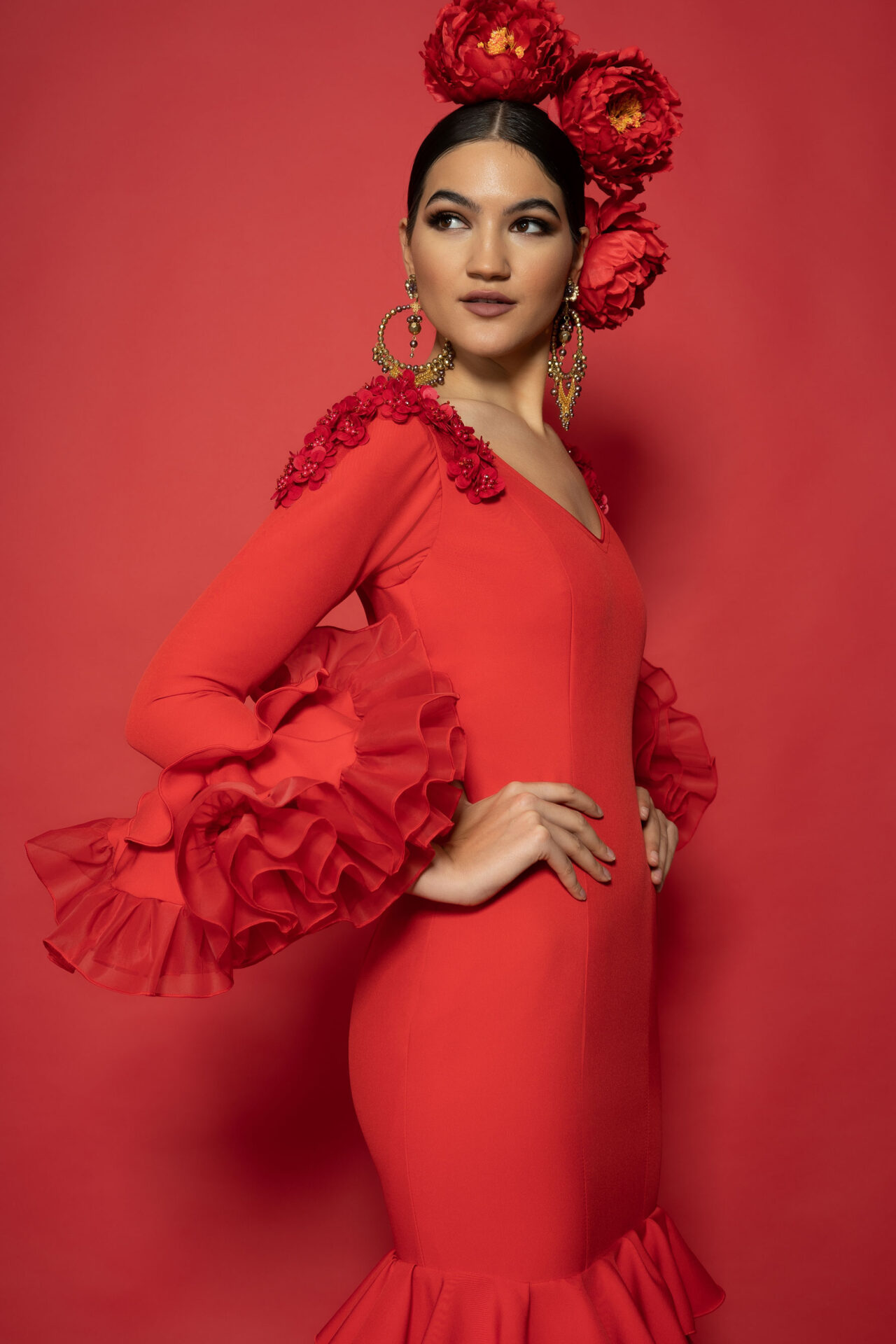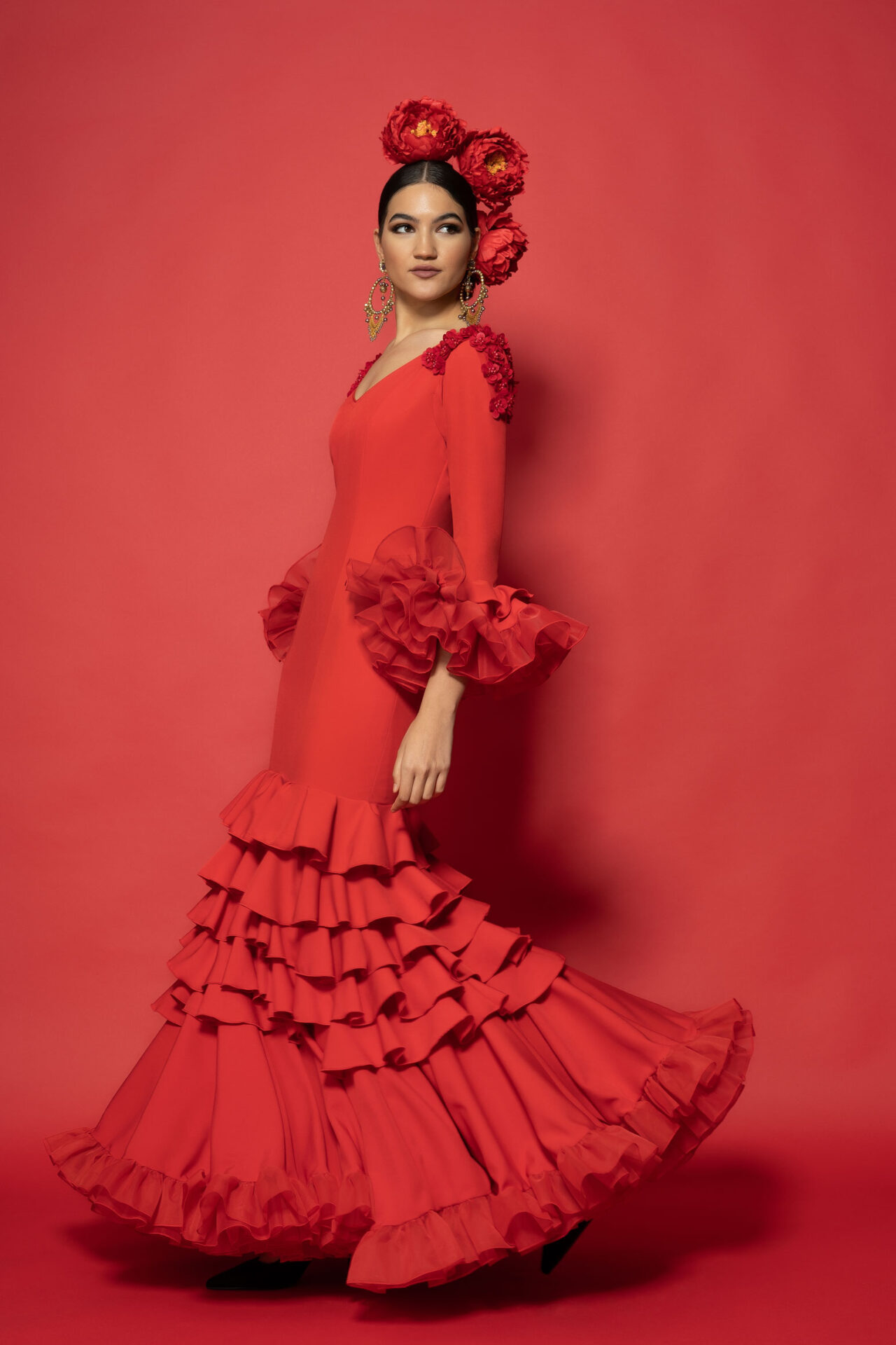 Vestido biolastan rojo con aplicaciones de rosas en los hombros y mangas y enagua de clavel en los bajos cuatro volantes pequeños y uno de mayor tamaño que le da volumen al traje