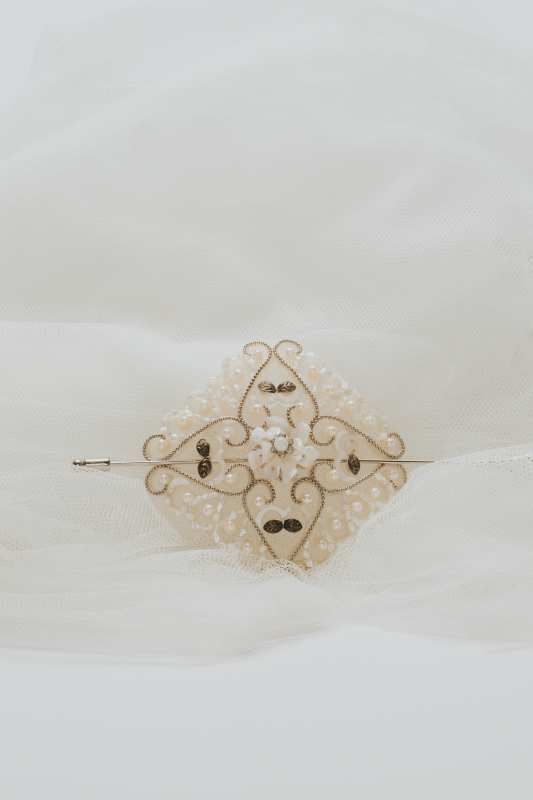 Pasador de nácar natural en forma de rombo y filigrana plata vieja