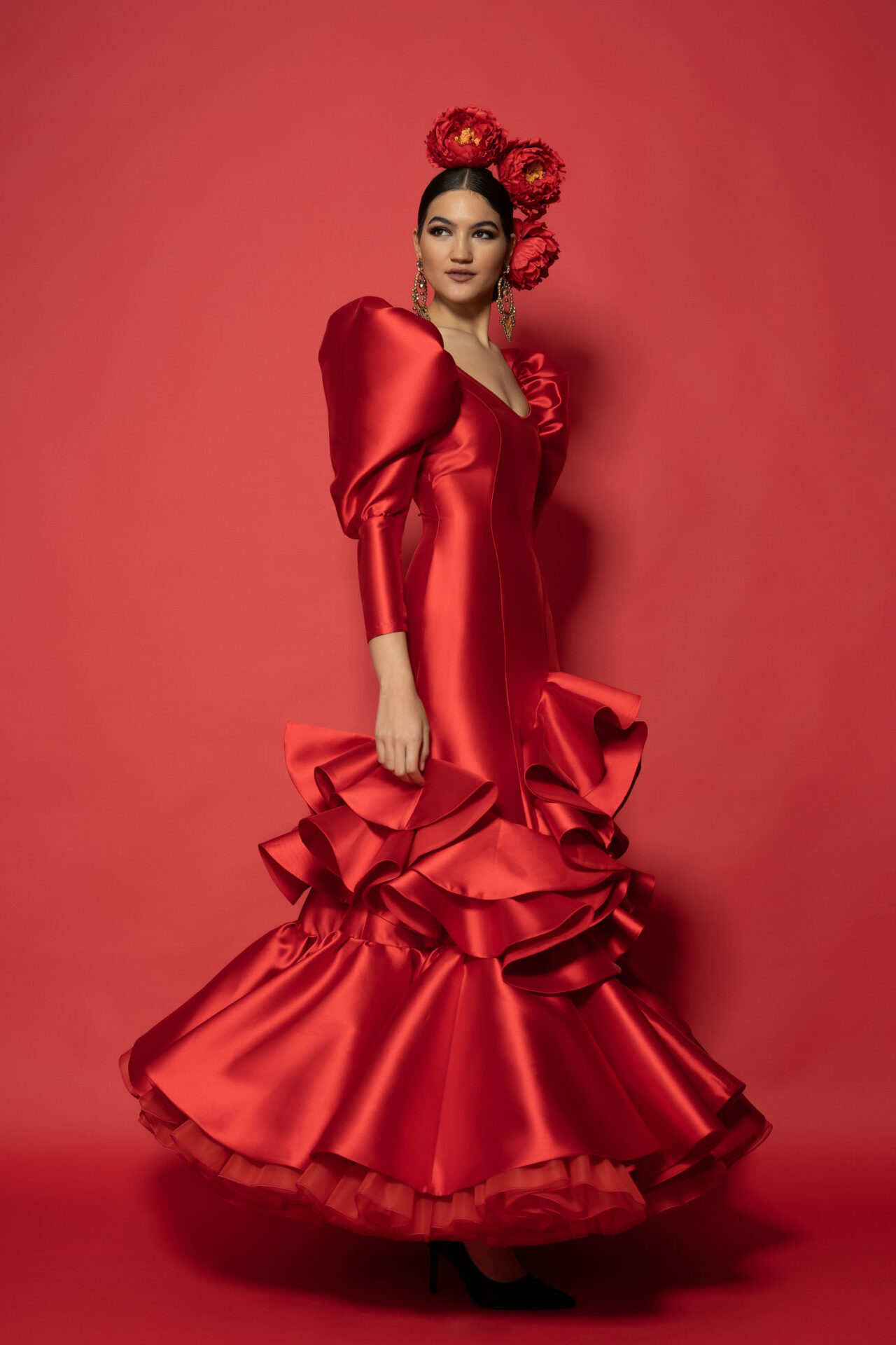 Vestido en mikado de seda rojo con volantes de capote y enaguas de clavel, manga abullonada con puño estrecho en el antebrazo, escote de pico