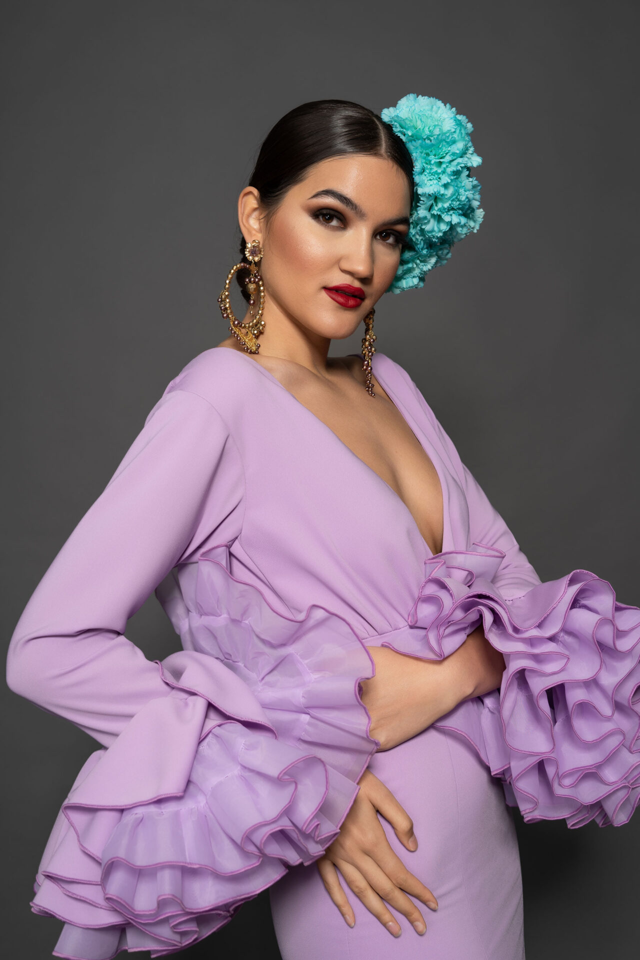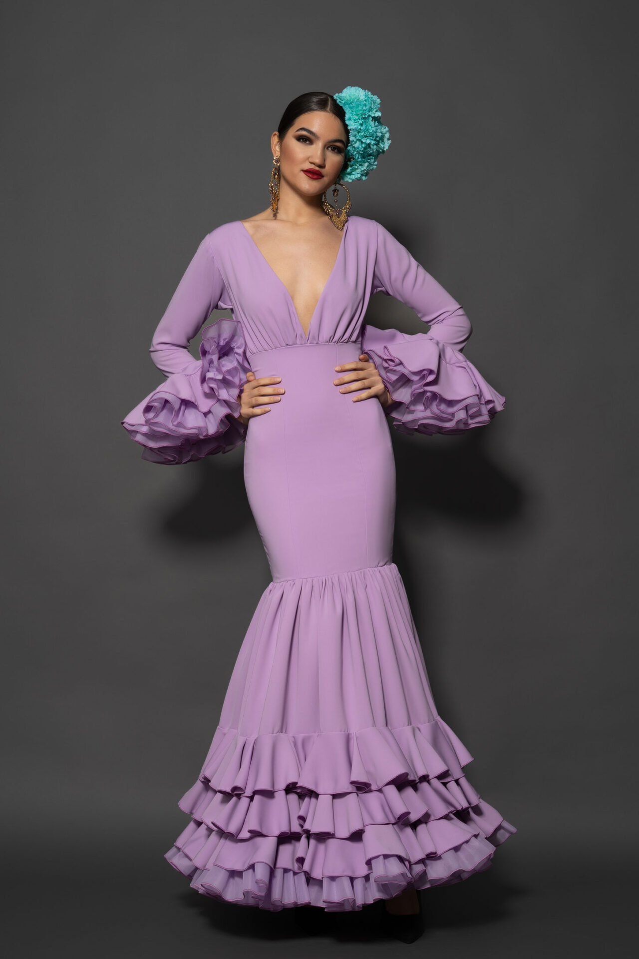 Vestido de elástico malva con corte debajo del pecho y escote de pico, falda con vuelo extra con tres volantes pequeños y enagua de clavel, magas con vuelo.