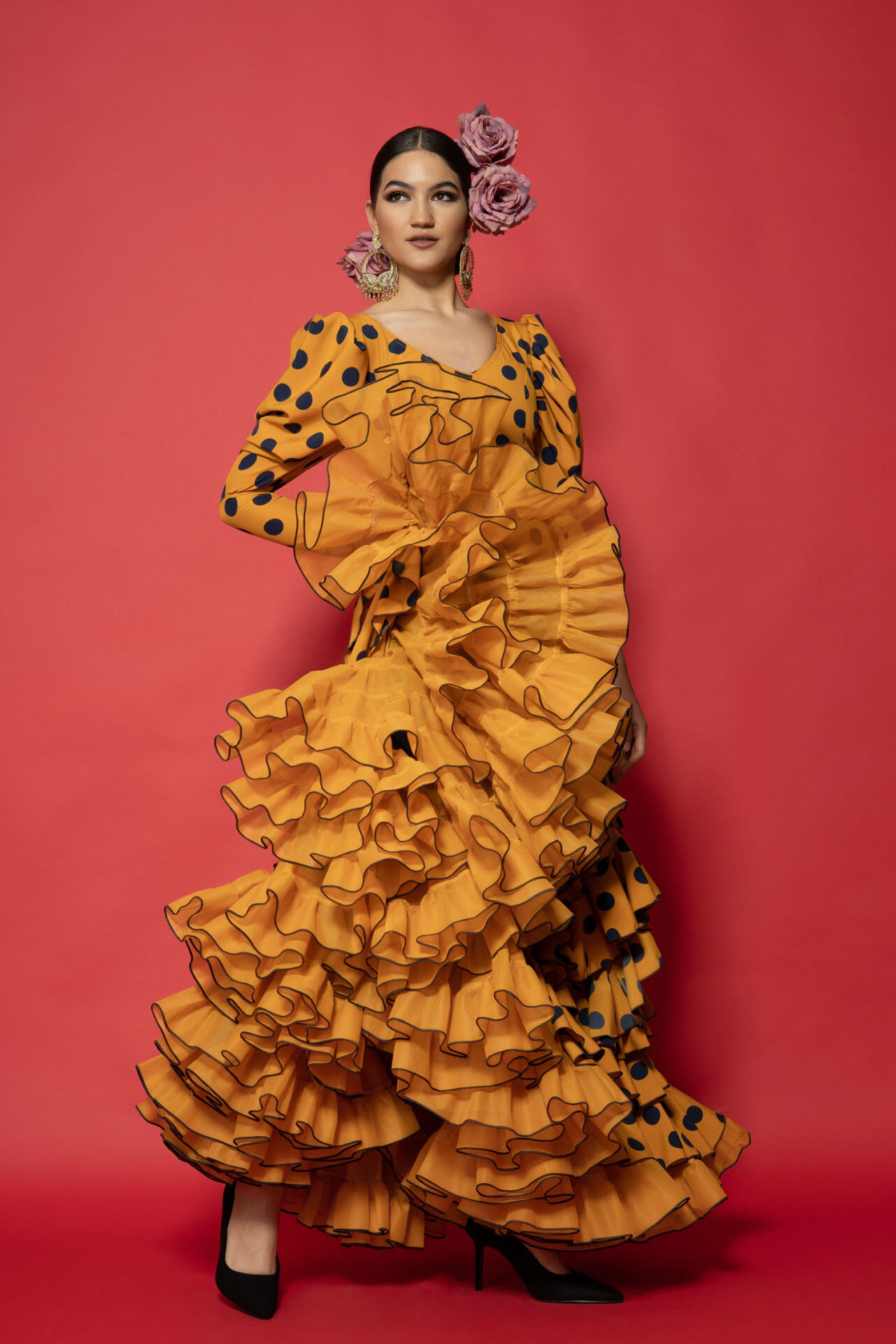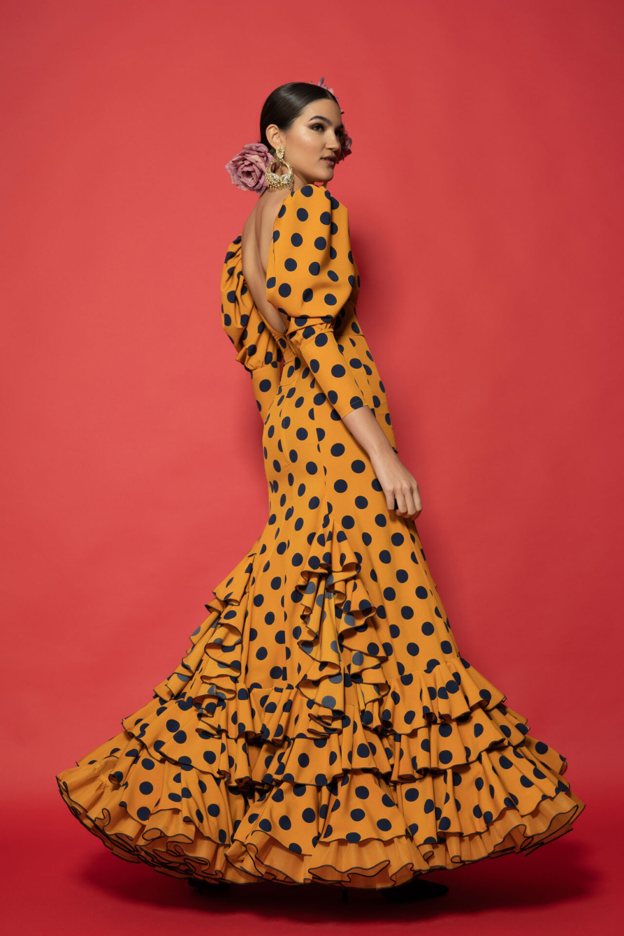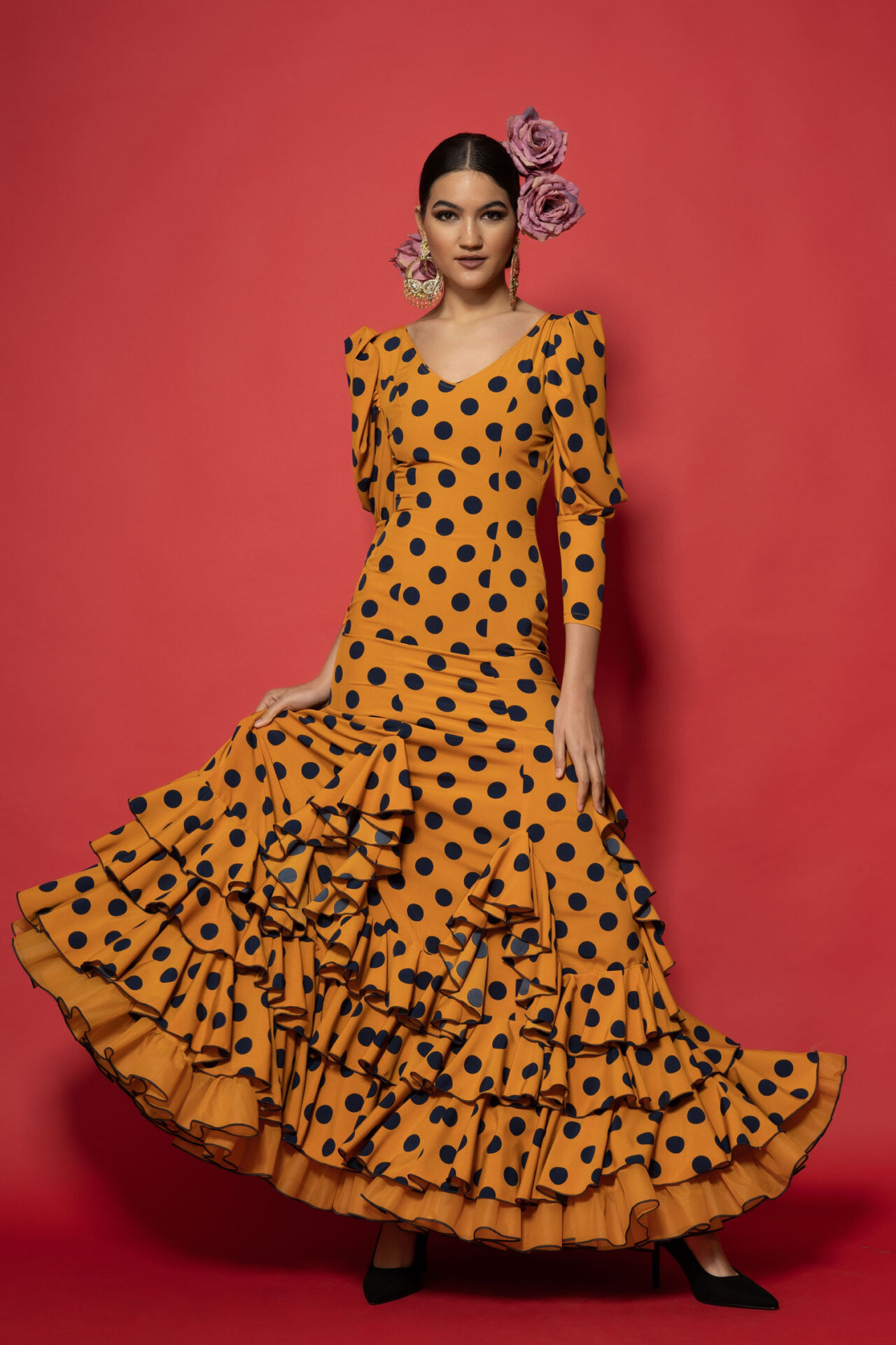 Vestido de crec de seda mostaza con lunares azul marino, enterizo con volantes con subidas y otro redondeando los bajos, manga abullonada y enagua de clavel
