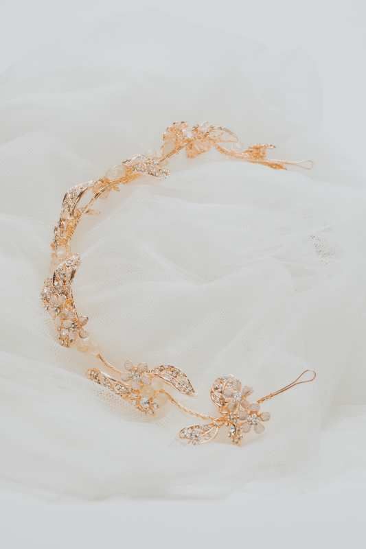 Tocado flexible en color champagn y perlas con zirconitas