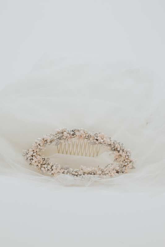 Tocado en forma de hoja en vano, con semillas en plata y rosa nude