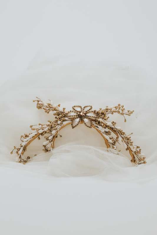 Tocado de oro viejo y flor de nácar central, semillas en dorado