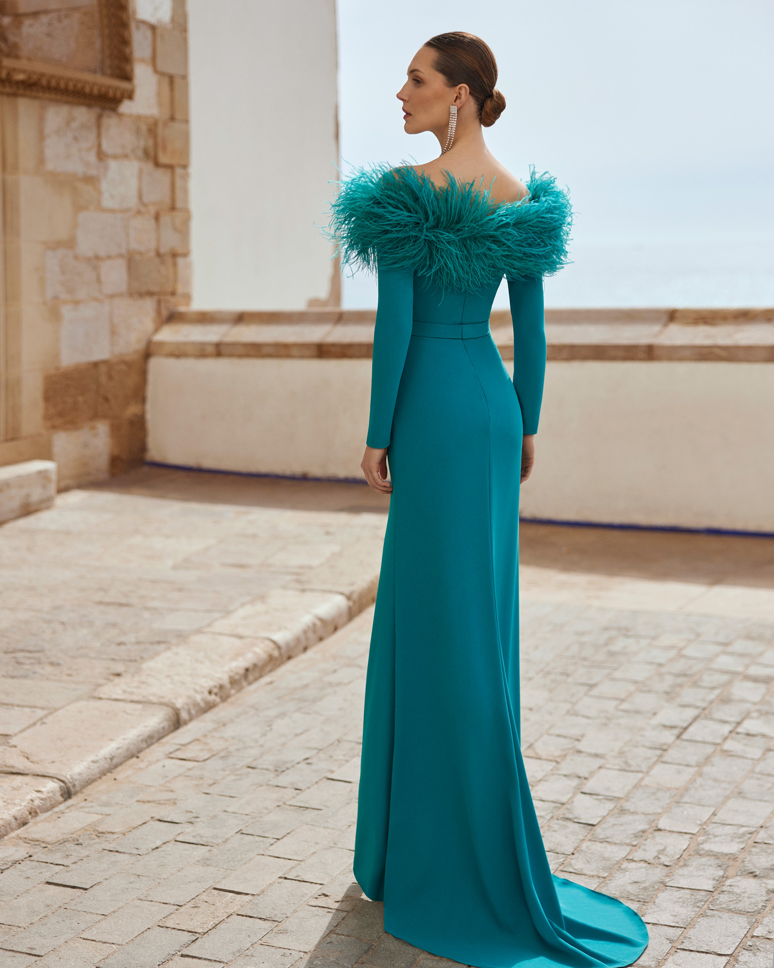VESTIDO CEREMONIA MANGA LARGA CON ESCOTE BARDOT CON PLUMAS