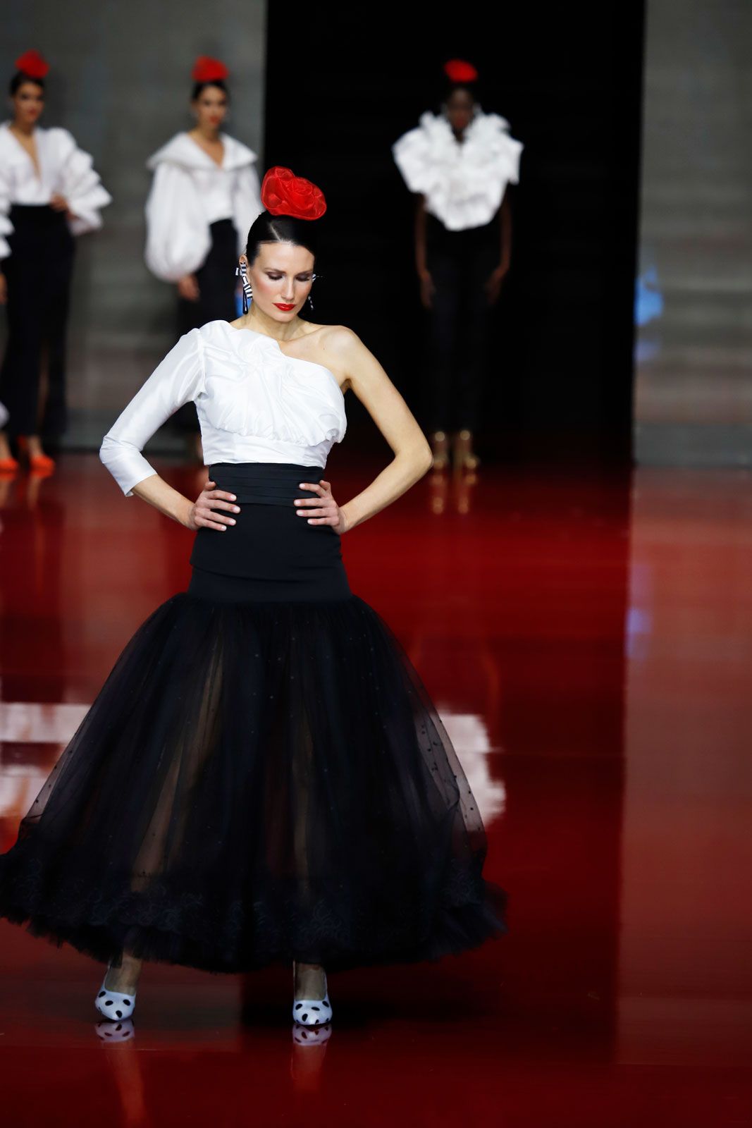 Camisa de seda asimetrica con drapeado en forma de flor, y falda de tul bordado con transparencia