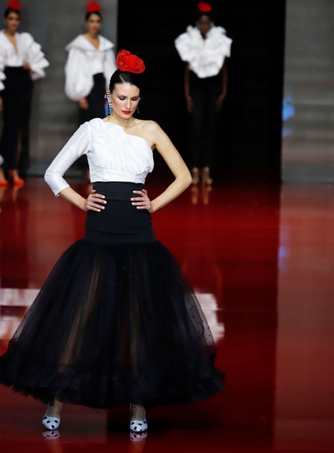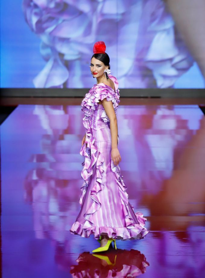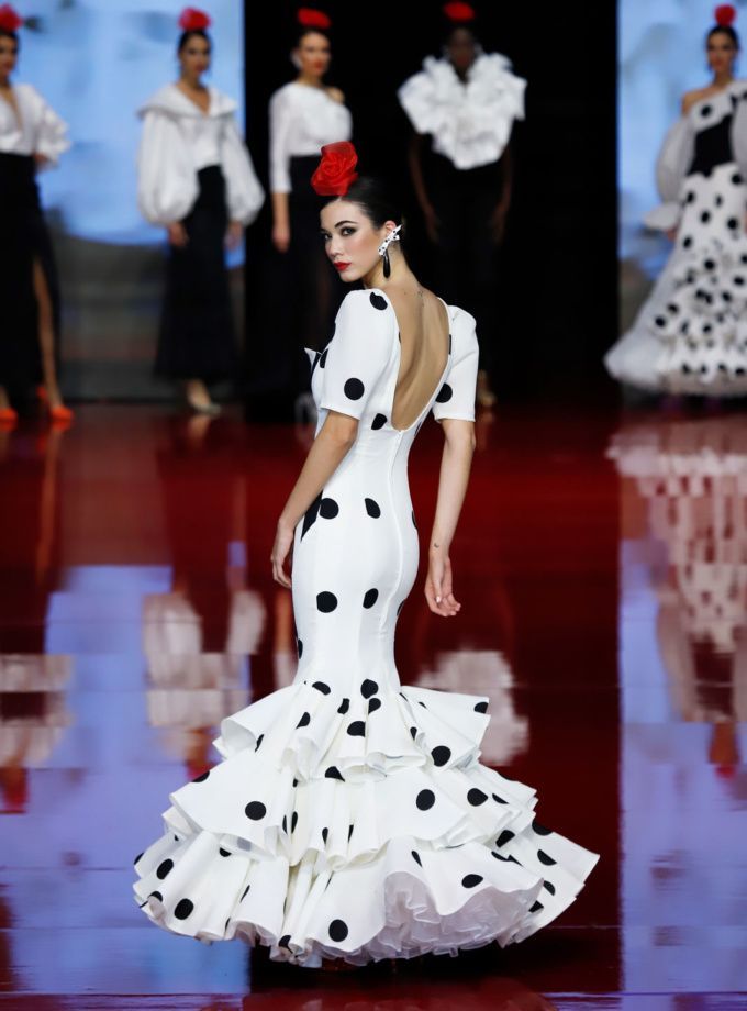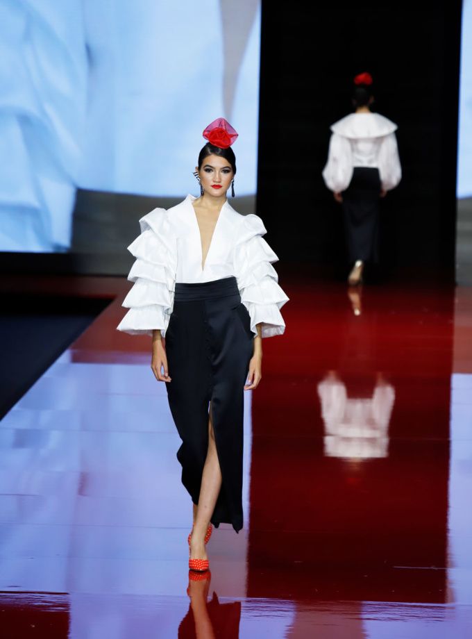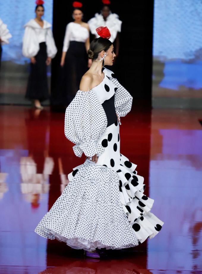 Vestido en crec de licra blanco con volante maxi forrado con sobreblusa de flores en rosa nude y mangas de volumen precio