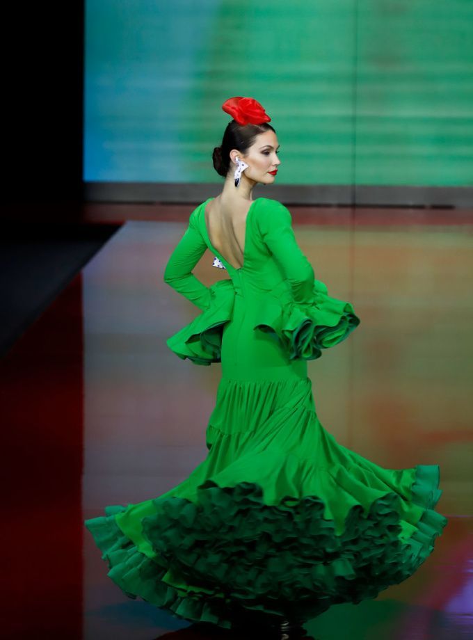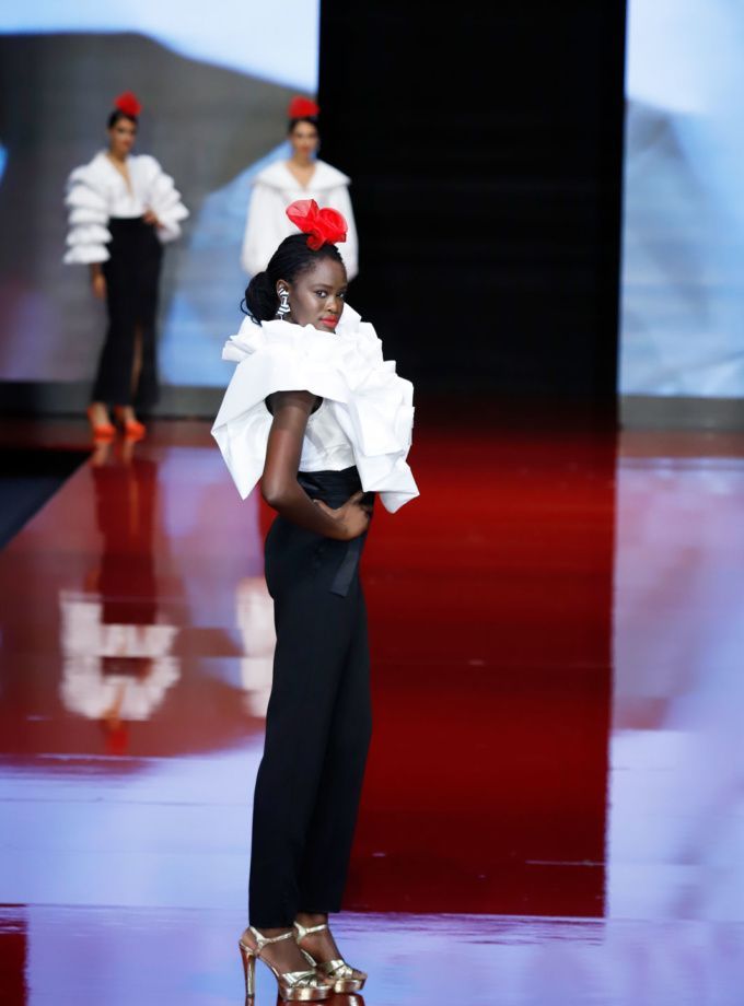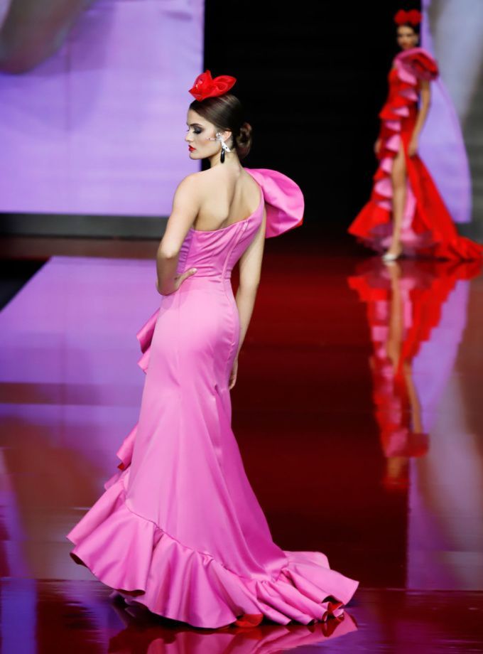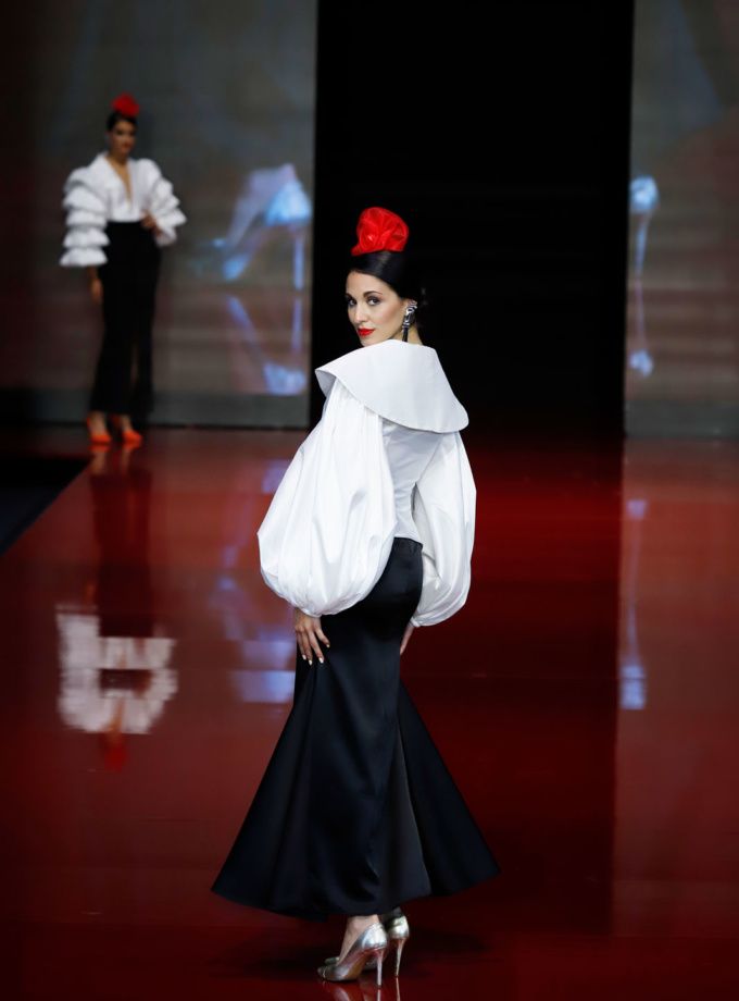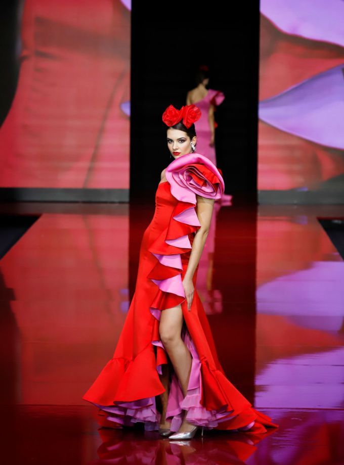 Vestido en crec de licra blanco con volante maxi forrado con sobreblusa de flores en rosa nude y mangas de volumen precio
