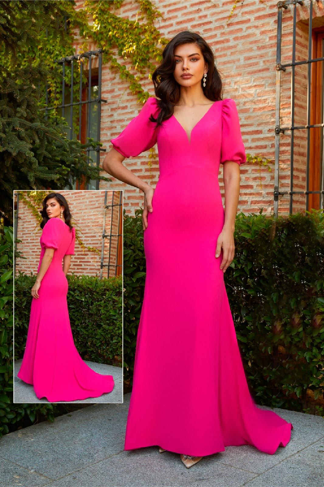 Vestido fucsia escote mangas volumen